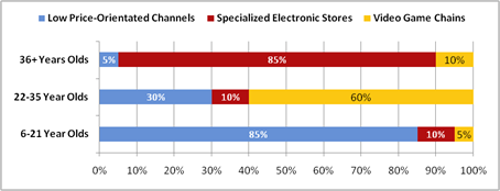 Figure 5 shows the shopping preferences of each segment for each channel. For example, 30% of the 22-35 Year Olds will usually shop in Low Price-Oriented Channels.