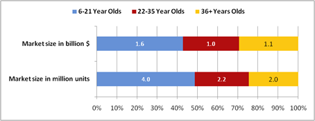 The market is divided into three major groups of customers, or segments, each having similar needs and purchasing behavior. The major defining demographic of each segment is age.