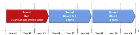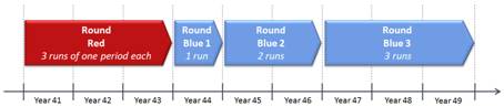 The simulation starts in Year 40 of the video game console era. The nine years during which you lead the organization – from Year 41 to Year 49 – are organized into four Rounds. A Round is broadly related to a particular set of learning objectives. Within a Round you may have one or more years as shown on the chart below: