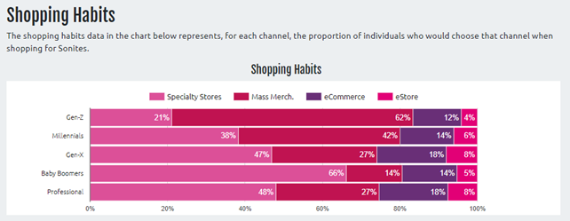 The shopping habit data represent, for each of the three channels, the proportion of individuals who would choose that channel when shopping for a Sonite or a Vodite product. See Figure 19 for a sample graph.