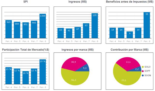 El cuadro de mando de la empresa le ofrece una página resumen de los indicadores clave de rendimiento de su empresa y de sus marcas, como los datos del mercado de valores, las cuotas de mercado en valor y en volumen, ingresos y contribuciones. El formato puede variar con el tiempo, especialmente cuando usted introduzca su primera marca Vodite. Un ejemplo del cuadro de mando de la empresa se representa en la Figura 12.