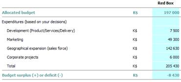 A budget is allocated each year to your company to cover its expenses in R&D, marketing, distribution and corporate projects. Your budget is linked to the success of your company in the previous year. Your budget for decision Round 2, for example, will be equal to a fixed percentage of your revenues in decision Round 1. However, there is a maximum level of revenues above which resources are reallocated to other business units in order to maximize the return on investment at the global level. Similarly, there is a minimum budget level for each year. If you are not generating sufficient contribution internally, global headquarters may subsidize your business unit so that you can continue operations.