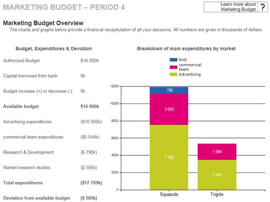 The budget overview in Figure 54 provides details on how you have decided to spend your marketing budget in the upcoming period. The chart shows whether you have received a loan or budget increase from your instructor. It also calculates your expenditures in the four main cost categories: communication, commercial team, research & development and market research. Finally, it shows your Deviation from budget, which should always be positive or equal to 0, unless you have been authorized by your instructor to exceed your budget. An error message will appear if the budget has been exceeded. This message should not be ignored; otherwise, the simulation will arbitrarily cut your expenditures (starting with communication).