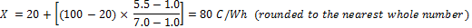 The perceptual map is not available when no products are marketed. However, you may still obtain information on segment needs from the semantic scales study. Let’s take an example and assume that Space Agencies have indicated that they are looking for products with a high value in Energy Efficiency, i.e. their ideal point is at 5.5 on the 1 to 7 scale. Our best option is to assume that there exists a linear relationship between the energy efficiency, from 20 to 100 cycles/Watt-hour and semantic scales, i.e. that the lowest energy efficiency –20– would be rated 1, and that the highest efficiency –100– would be rated 7. In this case, the formula to convert the ideal 5.5 into energy efficiency is: