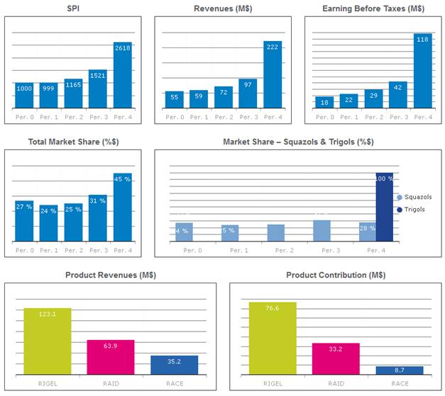 The company dashboard provides you with a one page summary of the key performance indicators of your firm and your products such as stock market data, market shares in value and volume, revenues and contribution. The layout will vary over time, especially when you introduce your first Trigol products. A sample company dashboard is depicted in Figure 11.