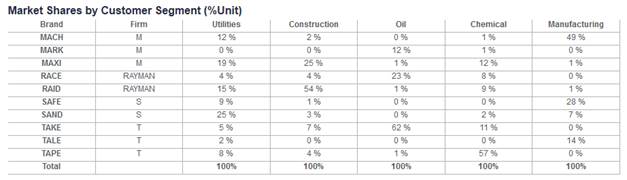 The customer panel study is based on a sample group of over 500 customers whose buying behavior is believed to be representative of the entire market. It provides market share by customer segment as well as industry sales in the product category. The market share figures represent the proportion of respondents who have purchased a given product during the simulated period. The report gives the information for each product currently on the market in total and by customer segment; see Figure 21.