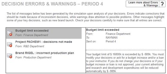 Typical errors include negative deviation from budget or missing marketing mix or commercial team decisions for newly launched products. Typical warnings include drastic changes in your decisions or completed R&D projects that have not been used to upgrade a product.