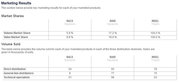Finally, the Marketing Results report provides key marketing results for each of your marketed products: market share in volume and value; volume sold and number of customers for each product in each distribution channels; total number of distributors in each distribution channel and proportion of distributors who carry a given product.