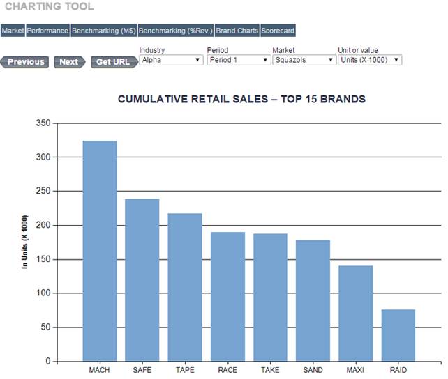 •Brand charts. Evolution of key performance indicators at brand level: retail sales; market shares; contribution. Brand charts are available in varying format, for instance top 5 brands across all marketed brands, or only the brands of a selected firm.