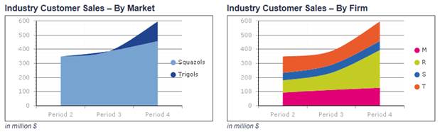 The industry dashboard provides you with a one page summary of key performance indicators at firm and product levels such as stock market data, retails sales and market shares in value and volume, revenues and contribution. The layout will vary over time, especially when the first Trigol products are put on the market. A partial industry dashboard is depicted in Figure 9.
