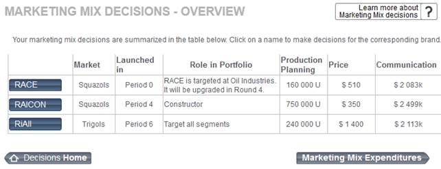 You will use two forms to make your marketing mix decision. Figure 45 shows the form that appears when you choose the marketing mix icon on the decision home. It gives an overview of your marketing mix decisions for all the products that you have chosen to market this period.
