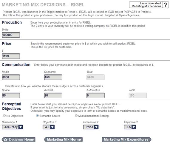 Click on a product name to zoom in this product. This will open the second decision form, displayed in Figure 46, where you can view and/or modify the detailed marketing mix decisions of this particular product.