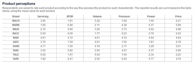 Product perceptions. Respondents are asked to rate each product on a scale from 1 to 7 according to the way they perceive the product. The reported results are summarized in a table such as the one in Figure 25, using the mean value for each product. For example, a product rated 2.3 on the Power scale is perceived as being less powerful than a product rating 5.5 on the same scale.