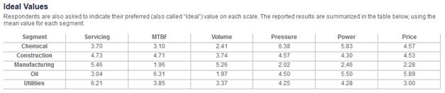 Ideal values. Respondents are also asked to indicate their preferred (also called “Ideal”) value on each scale. The reported results are summarized in a table such as the one in Figure 26, using the mean value for each segment.