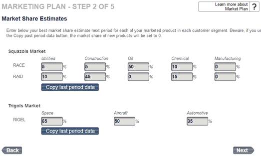 When making these estimates, make sure to take into account your own decisions as well as the most likely ones of your competitors. In particular, your product introductions or upgrades and the expected ones from competitors should be examined closely to best estimate their effects on your product market shares.