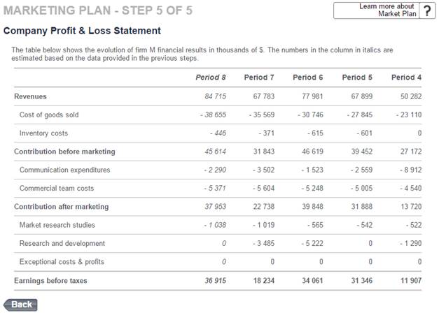 On the basis of your decisions and your estimates for segment sizes and product shares, the marketing plan tool can make financial projections for the decision period. This form, depicted in Figure 65, shows a pro forma firm profit and loss statement, similar to the one in your annual report.